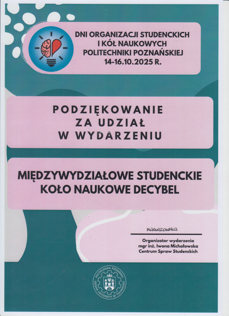 W dniu 15 czerwca 2025 roku odbyły się Dni Organizacji Studenckich i Kół Naukowych. MSKN Decybel przedstawił przykładowe projekty wykonywane w ramach pracy w kole naukowym. Nasi członkowie zachęcali do dołączenia do koła, w celu realizacji własnych projektów oraz rozwoju swoich pasji i umiejętności.